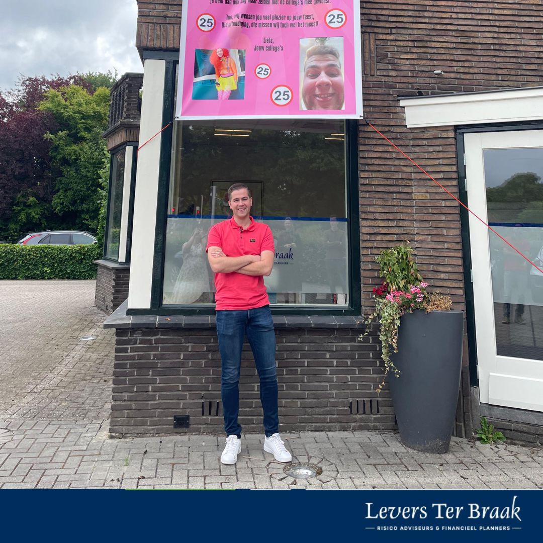 Vandaag is onze hypotheek- en financieel adviseur Ton 25 jaar geworden. We hebben hem gister verrast met een toepasselijk spandoek. Vandaag is Ton even een dagje vrij, maar morgen staat hij weer klaar voor u!